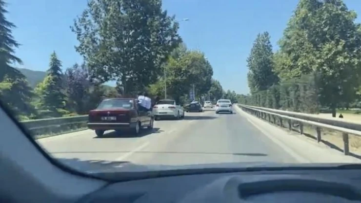 Merkez Osmangazi ilçesi Soğanlı yakın çevre yolunda düğün konvoyunda araçların camlarına oturan kişileri görenler şaşkınlık yaşadı.