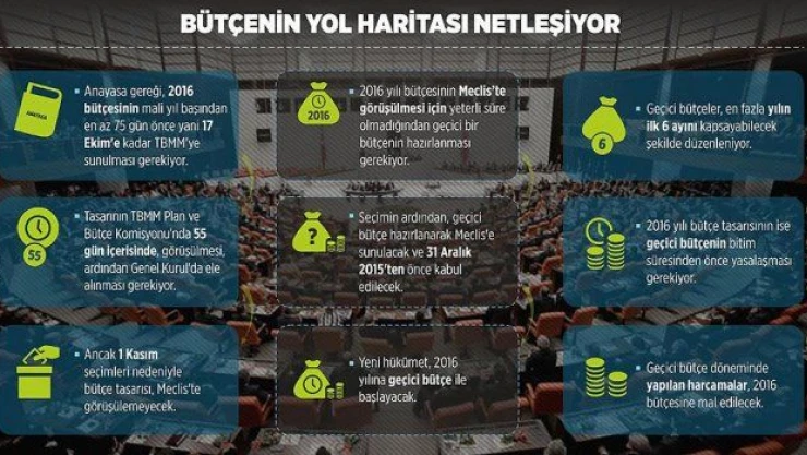 Maliye Bakanlığı, 2016 bütçesini, Anayasa gereği 17 Ekim'e kadar TBMM Başkanlığına sunacak ancak 1 Kasım seçimleri nedeniyle bütçe tasarısı, Mecliste görüşülemeyecek ve kadük kalacak. Seçimin ardından, 2002 yılında olduğu gibi geçici bütçe hazırlanarak Meclise sunulacak ve 31 Aralık 2015'ten önce kabul edilecek.