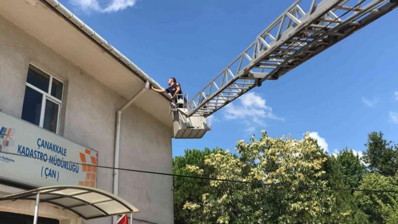 Çanakkale’nin Çan ilçesinde Menderes Parkı civarında bir binanın çatısında bulunan yağmur suyu olukları ile bina arasında bir kuşun sıkıştığını fark eden vatandaşlar durumu 112 Acil Çağrı Merkezine bildirdi. İhbar üzerine olay yerine Çan Belediyesi İtfaiye Müdürlüğü tarafından ekip sevk edildi. Bölgeye gelen itfaiye ekipleri araç merdiveniyle çatıya çıkarak boynuna ip dolanarak sıkışan Ebabil kuşu kurtarıldı.