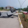 Karabük’ün Safranbolu ilçesinde kavşakta meydana gelen kazada çarpışan iki otomobilden biri ters döndü.
