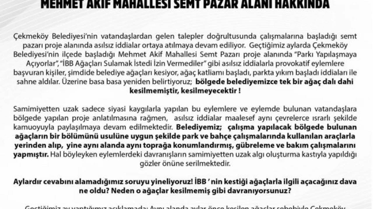 Çekmeköy Belediyesi tarafından yapımına başlanan Mehmet Akif Mahallesi Semt Pazarı’nda yapılan çalışmalarla ilgili “Belediye ağaçları kesiyor, ağaç katliamı başladı” gibi iddialara ilişkin basın açıklaması yapıldı. Açıklamada, “Çekmeköy Belediyesinin vatandaşlardan gelen talepler doğrultusunda çalışmalarına başladığı semt pazarı proje alanında asılsız iddialar ortaya atılmaya devam ediliyor. Geçtiğimiz aylarda Çekmeköy Belediyesi’nin ilçede başladığı Mehmet Akif Mahallesi Semt Pazarı proje alanında ’Parkı Yapılaşmaya Açıyorlar’, ’İBB Ağaçları Sulamak İstedi İzin Vermediler’ gibi asılsız iddialarla provokatif eylemlere başvuran kişiler, şimdide belediye ağaçları kesiyor, ağaç katliamı başladı, parkta yıkım başladı iddiaları ile sahne aldılar. Üzerine basa basa yeniden belirtiyoruz; bölgede belediyemizce tek bir ağaç dalı dahi kesilmemiştir, kesilmeyecektir!” ifadelerine yer verildi.