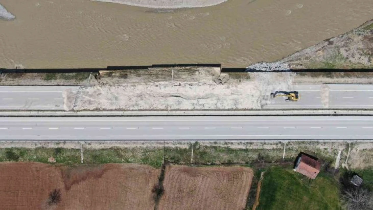 Kastamonu’nun Araç ilçesinde 8 Nisan tarihinde etkili olan kuvvetli sağanak yağış ve kar suları, Araç Çayı’nın taşma noktasına ulaşmasına sebep oldu. Çayın debisinin yükselmesi neticesinde Araç ilçesine bağlı Yeşilova köyü mevkiinde Kastamonu-Karabük karayolunun tek şeridi, istinat duvarının yıkılması sebebiyle çöktü. Yaşanan olayın ardından yolun Karabük istikameti trafiğe kapatıldı. Karayolları ekipleri tarafından çöken yolun onarılması için çalışmalar devam ediyor. Karabük istikameti trafiğe kapatılan yolda, ulaşım kontrollü olarak Kastamonu istikametinde sağlanıyor. Çalışmaların tamamlanmasının ardından Karabük istikameti yeniden trafiğe açılacak.