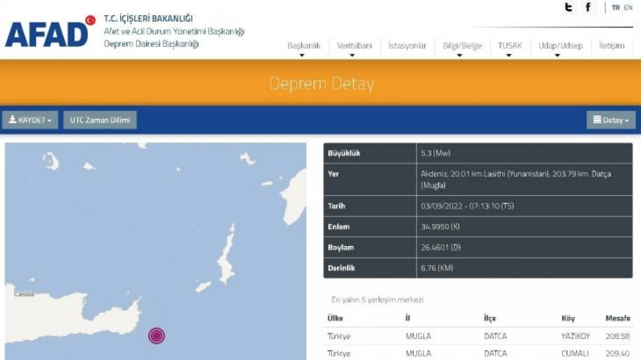 Afet ve Acil Durum Yönetim Başkanlığı (AFAD) Deprem Dairesi Başkanlığı tarafından yapılan açıklamaya göre, Datça ilçesi açıklarında 5.3 büyüklüğünde deprem meydana geldi. Deprem, Datça’nın 203.79 kilometre açığında saat 07.13 sıralarında 6.76 kilometre derinlikte gerçekleşti. AFAD tarafından depremde herhangi bir olumsuzluk yaşanmadığı bildirildi.