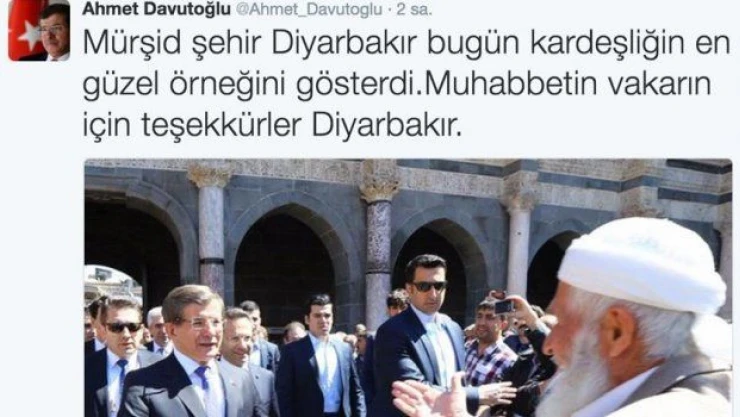 Davutoğlu, sosyal paylaşım sitesi Twitter hesabından yaptığı paylaşımında, "Mürşid şehir Diyarbakır bugün kardeşliğin en güzel örneğini gösterdi. Muhabbetin, vakarın için teşekkürler Diyarbakır." ifadelerine yer verdi.