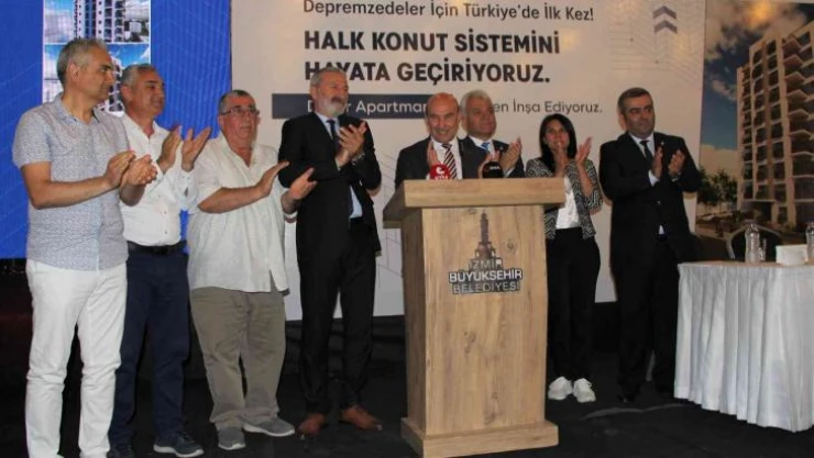 İzmir Büyükşehir Belediyesi'nin depremzedeler için uygulamaya koyduğu ve Türkiye'de ilk kez uygulanacak olan Halk Konut projesinde imzalar atıldı. İmza töreninde konuşan İzmir Büyükşehir Belediye Başkanı Tunç Soyer, dayanışmayla altından kalkılmayacak hiçbir zorluk olmadığını vurgulayarak, 'Müteahhitler ihalelerden uzak duruyorlardı. Halk Konut projemizle kentsel dönüşüm çalışmalarına kooperatif modelini ekledik. Türkiye'ye örnek olacağız' dedi.