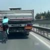 E-5 Karayolunda Küçükçekmece Cennet Mahallesi mevkiinde ilerleyen bir bisikletli görenlerin yüreklerini ağızlara getirdi. E-5 karayolundaki bisikletli, bir tırın arkasına yanaşıp, kasadaki iplerden tutunarak uzun bir süre ilerledi. Yoldaki hafif rampada tırdan tutunmakta zorlanan bisikletli pedallarını hızla çevirerek tırın dibine girmeye çalıştı. Tırın ani bir freninde muhtemel bir facianın yaşanabilecekken bir süre sonra tıra yetişemeyen bisikletli, arkasını kontrol etmeden, genellikle motosikletlilerin kullandığı emniyet şeridine dikkatsiz bir şekilde geçiş yaptı. Bu sırada arkasından herhangi bir aracın gelmiyor olması ise muhtemel bir kazayı önledi. Bisikletlinin kendi canını ve trafikteki diğer sürücülerin canını hiçe saydığı o anlar ise başka bir araçta bulunanlar tarafından cep telefonu kamerasına yansıdı.