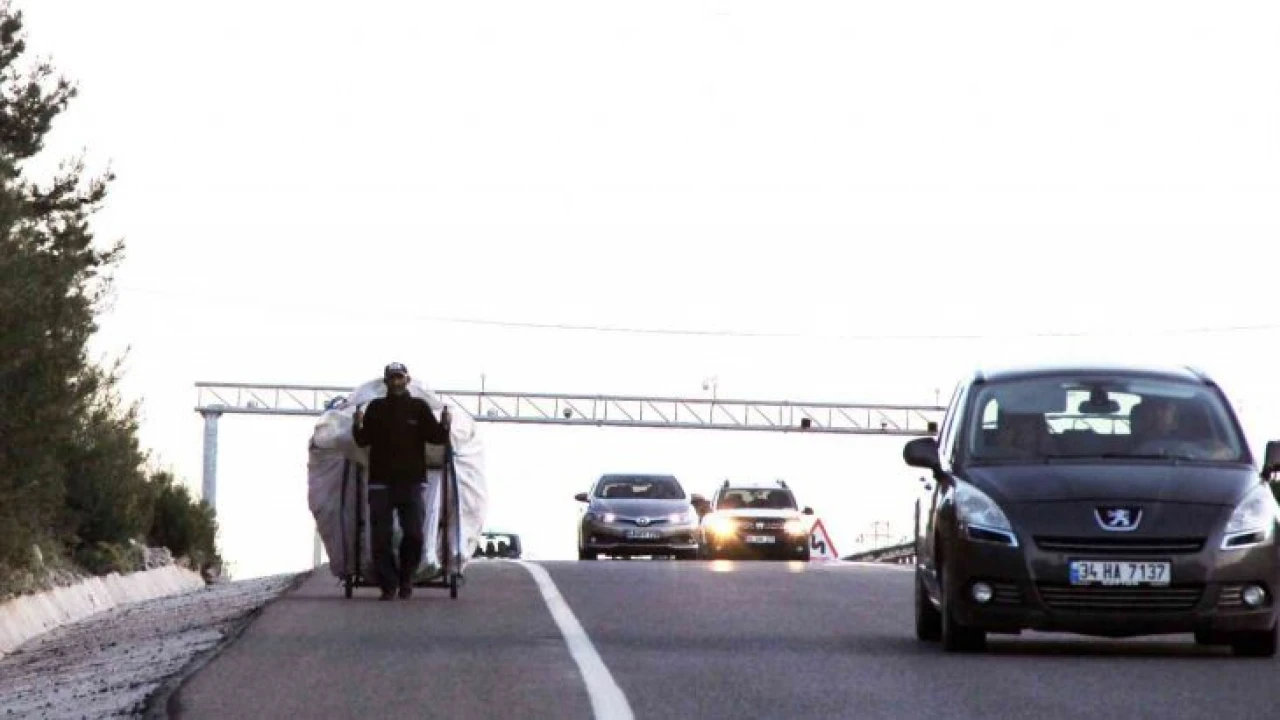 Yaya olarak 350 kilometre yol yapan Erol Adıyaman, hem karayolu kenarındaki teneke hurda kutuları temizliyor, hem de para kazanıyor. Ekmek parası için yollara düştüğünü belirten vatandaş, Muğla’dan Aydın, İzmir, Afyonkarahisar, Uşak ve tekrar Antalya’ya ulaşmayı hedefliyor. Geceleri el arabasında bulunan çadırında yatıp kalktığını belirten Erol Adıyaman, iş yok diyenlere ‘Yollarda iş çok’ diye cevap veriyor. Yollarda özellikle rampa çıkışlarda kendisine motosiklet ile el arabasını çekmek için yardımcı olan vatandaşlara teşekkür eden Adıyaman, yoluna devam ediyor.