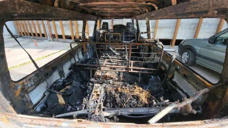 Hastane otoparkında alev alan minibüs paniğe neden oldu