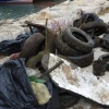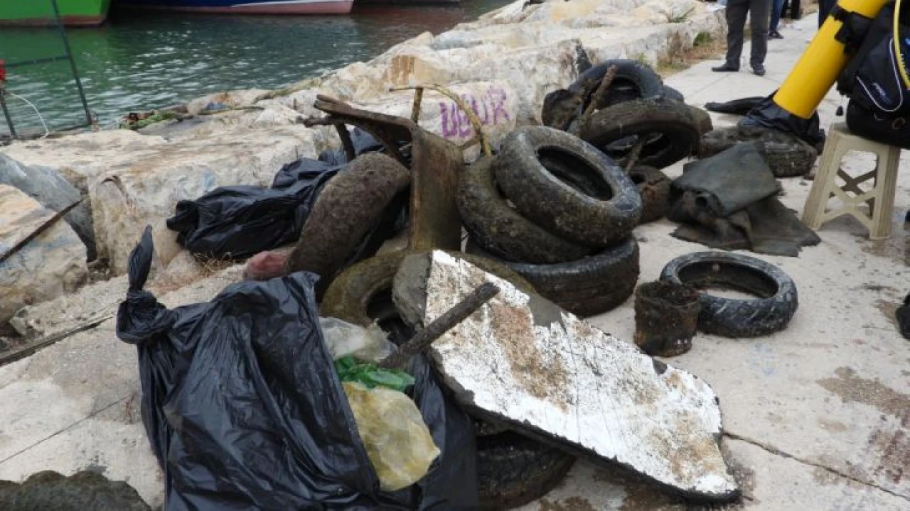 Hatay'ın Samandağ ilçesinde denizde yapılan dip temizliğinde sandalye ve araba lastikleri çıktı.
