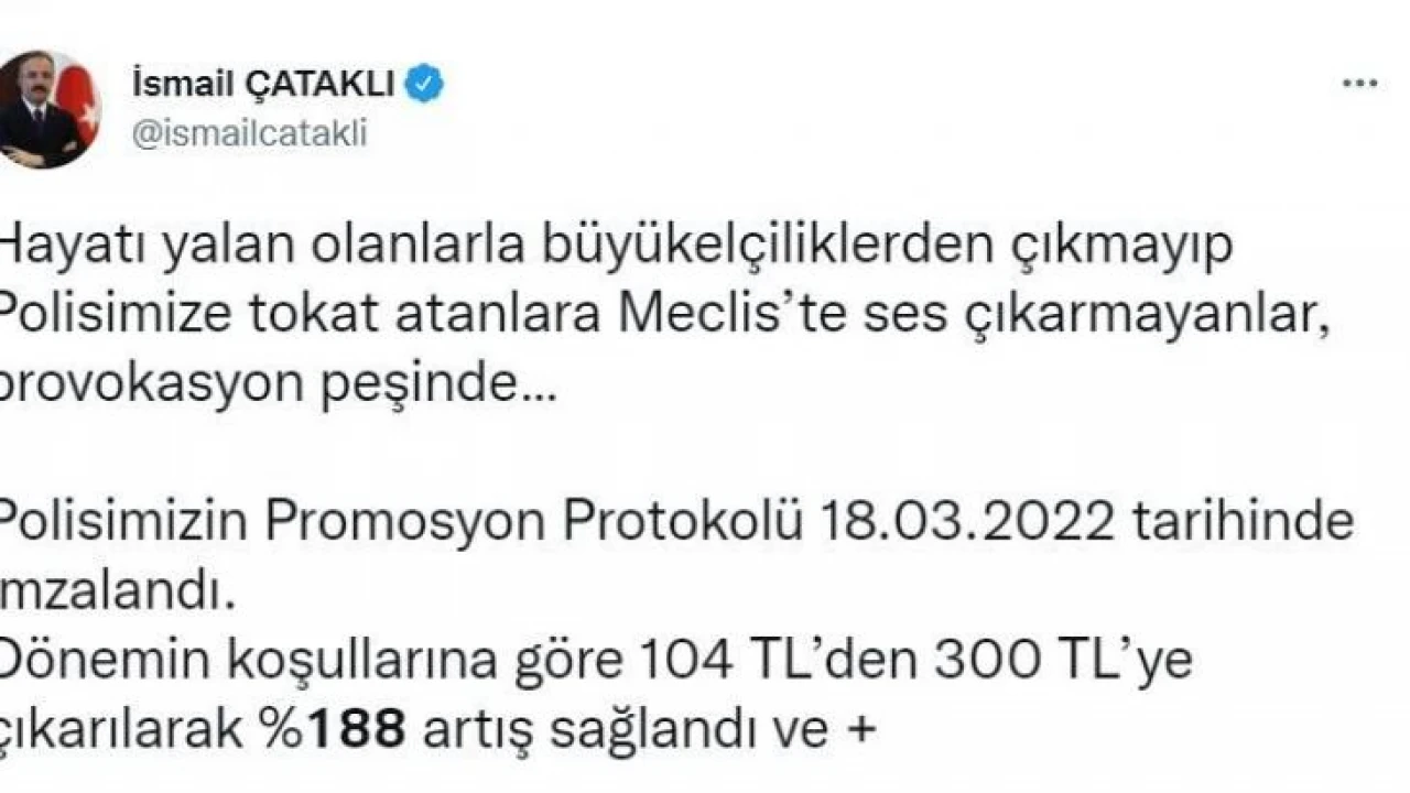 “Hayatı yalan olanlarla büyükelçiliklerden çıkmayıp Polisimize tokat atanlara Meclis’te ses çıkarmayanlar, provokasyon peşinde. Polisimizin Promosyon Protokolü 18.03.2022 tarihinde imzalandı. Dönemin koşullarına göre 104 TL’den 300 TL’ye çıkarılarak yüzde 188 artış sağlandı ve 6 ayda bir de memur maaş zammı oranında artış getirildi. Değişen ekonomik koşullar nedeniyle Polisimize ve Bakanlığımızın diğer personeline yönelik VakıfBank ile maaş promosyonuna ilişkin görüşmeler bir aydır devam ediyor. Farkındayız, rol çalmaya çalışıyorsunuz.”