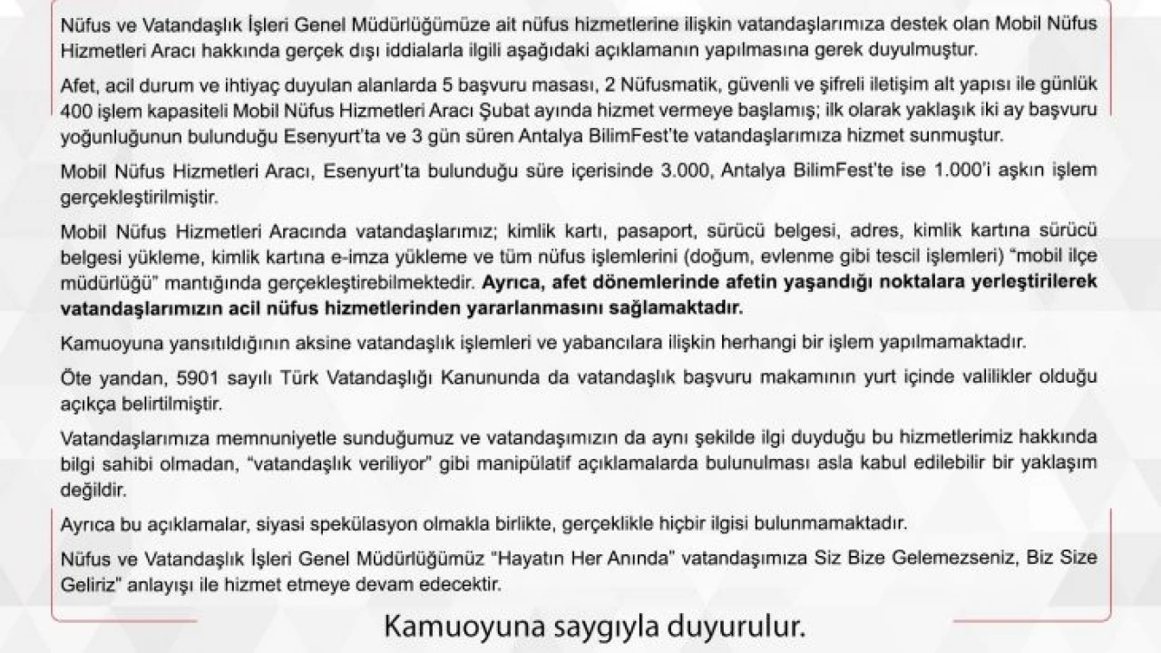İçişleri Bakanlığı yaptığı açıklamada, Mobil Nüfus Hizmetleri Araçları’nın vatandaşlık işlemleri ve yabancılara ilişkin herhangi bir işlem yapılmadığının altını çizerek şu ifadelere yer verdi: