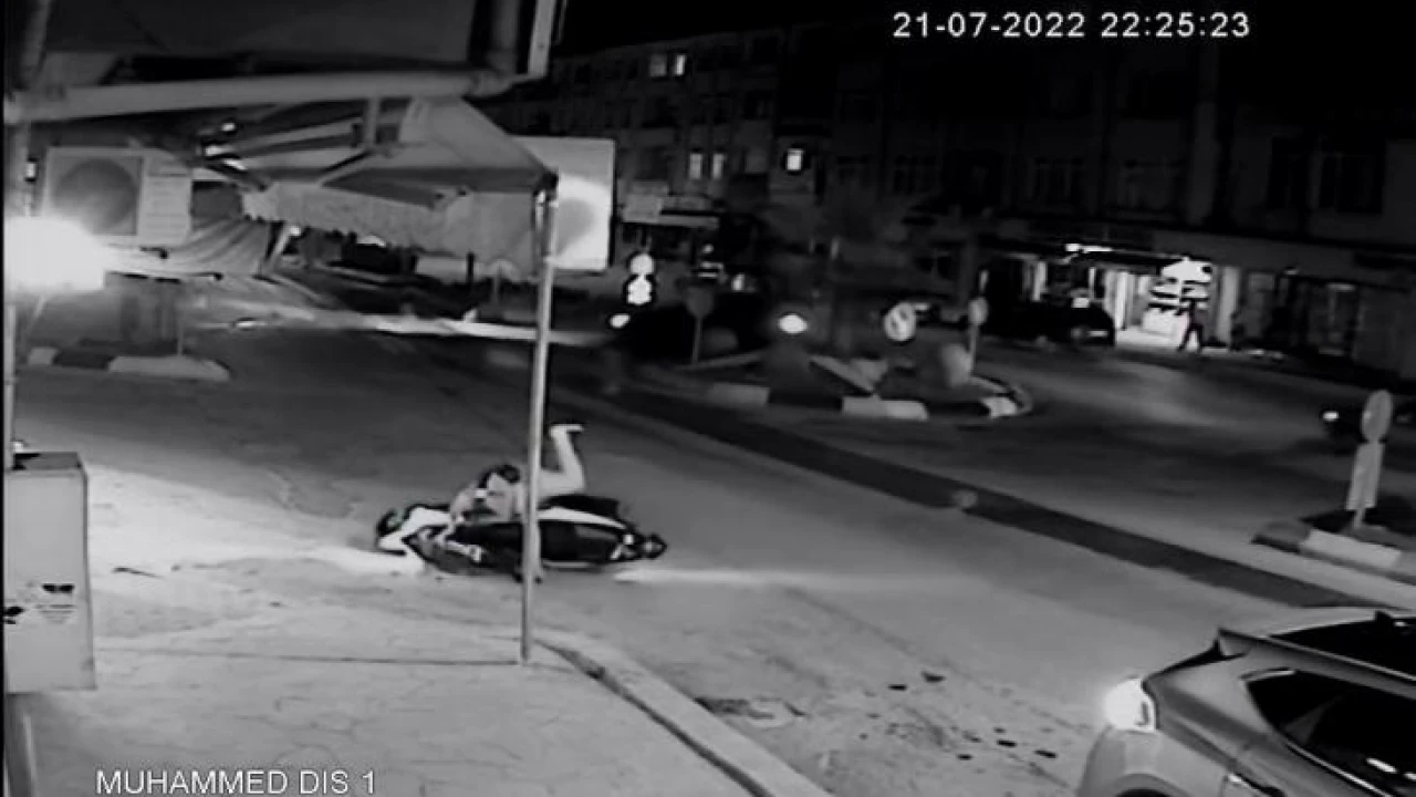 Sakarya'nın Akyazı ilçesinde ıslak yol, otomobilin kontrolden çıkarak refüje çarpmasına ve dönüş yapmak isteyen motosikletin devrilmesine sebep oldu. Meydana gelen kazalar güvenlik kamerası tarafından görüntülendi.