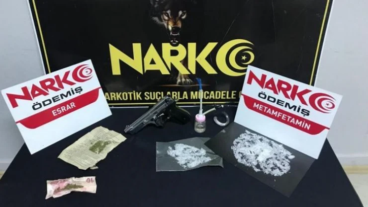 Polis ekiplerince adreste yapılan aramada sentetik ecza, esrar ve metamfetamin maddesinin yanı sıra hassas terazi de ele geçirildi.