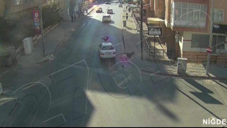 Niğde'de yolun karşısına geçmeye çalışan 2 kadına otomobil çarptı. Kadınlardan biri kaldırıma savrulurken, aracın üzerinde kalan kadın ise 20 metre sürüklendi.