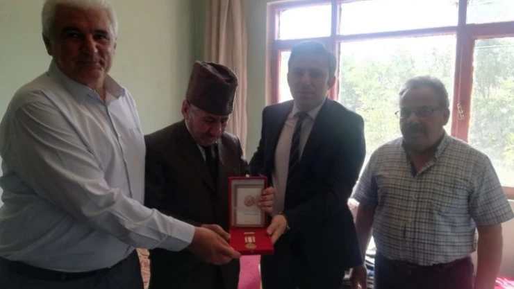 Hanönü Kaymakamı Emrah Bütün, Kastamonu Aile ve Sosyal Hizmetler İl Müdürü Abdullah Savaş ile birlikte Kıbrıs Gazisi Abdullah Şimşek için yaptırılan gazilik madalyasını ikametinde verdi.