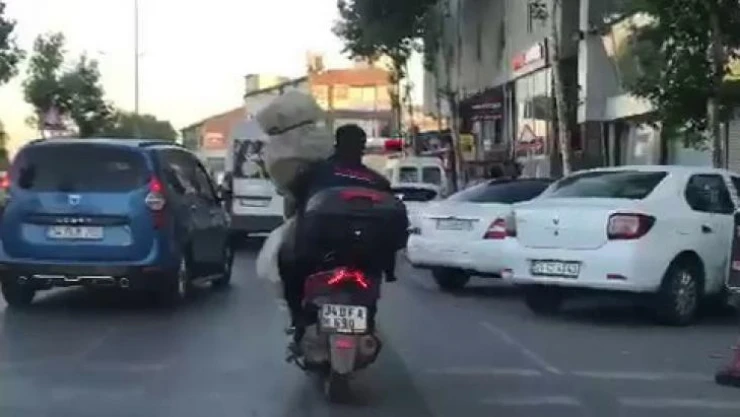 Olay geçtiğimiz gün Küçükçekmece İkitelli’de meydana geldi. Edinilen bilgiye göre bir motosikletli, kendisinden büyük bir yükle seyir halindeydi. Sabit tutamadığı yüküyle yolculuk yapmaya çalışan sürücünün tehlikeli yolculuğu kameralara yansıdı. Motosikletlinin trafiği de tehlikeye anları görüntüleyen başka bir sürücü ise şaşkınlığını gizleyemeyerek, “Kaskı yok, kocaman bir yükü var kucağında. Yükü sabit değil neredeyse düştü düşecek. Önümüze düşecek başımıza bela olacak” dedi.