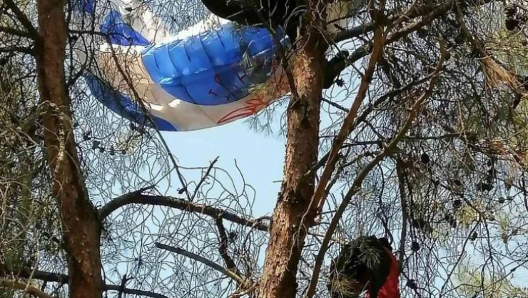 Manisa'da amatör paraşütçü ağaca asılı kaldı