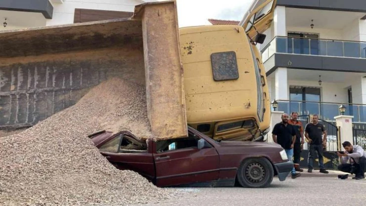 Mıcır yüklü kamyon Mercedes'i hurdaya çevirdi
