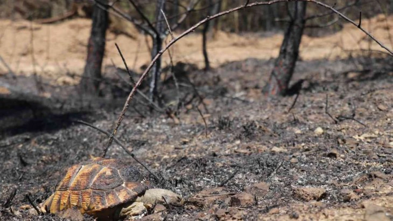 Yaklaşık 6 hektarlık alanın yandığı bölgedeki zarar havadan görüntülendi. Ekipler, herhangi bir olumsuzluk olmaması adına bölgede soğutma çalışmalarını sürdürürken alevlerden kaçamayarak telef olan kaplumbağanın görüntüsü ise yürekleri sızlattı.