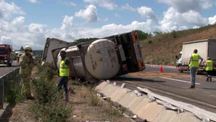 Kaza Sarıyer Kuzey Marmara Otoyolu Edirne istikameti Çiftalan mevkiinde saat 14.30 sıralarında meydana geldi. İddiaya göre 41 GH 096 plakalı kimyasal madde yüklü tanker seyir halindeyken bir araç aniden önüne kırdı. Sürücü Fazlı Uluçay’ın direksiyon hakimiyetini kaybettiği tanker, yola devrildi. İhbar üzerine olay yerine jandarma, itfaiye ve sağlık ekipleri sevk edildi. Tankerde sıkışan şoför vatandaşların yardımıyla araçtan çıkarılarak, yola kenarına alındı. Olay yerine gelen ekipler çevrede güvenlik önlemi alırken, bacağı kopan tanker şoförü Uluçay sağlık ekiplerinin ilk müdahalesinin ardından ambulansla hastaneye kaldırıldı.
