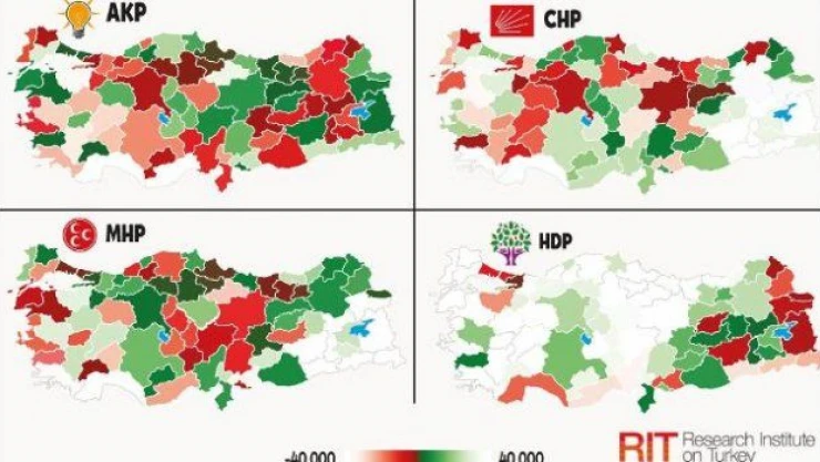 Haritalarda kırmızı renk partilerin milletvekili kaybetmeye, yeşil ise ek bir milletvekili kazanmaya sayıca yakın olduğu illeri gösteriyor. Renkler koyulaştıkça o ilde partiler milletvekili kazanmaya ya da kaybetmeye yaklaşıyor. Bulguları incelerken bazı illerde çok sayıda oyun kolaylıkla başka partilere gidebileceğini, bazı illerde ise az sayıda oyun parti değiştirmesinin zor olabileceğini unutmamalı.