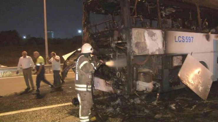 İstanbul'da havalimanı çalışanlarını getiren servis otobüsü Kuzey Marmara Otoyolu'nda alev alev yanarken, çalışanların otobüsü zamanında boşaltması facianın önüne geçti. İtfaiye ekipleri tarafından güçlükle söndürülen otobüs kullanılamaz hale geldi.