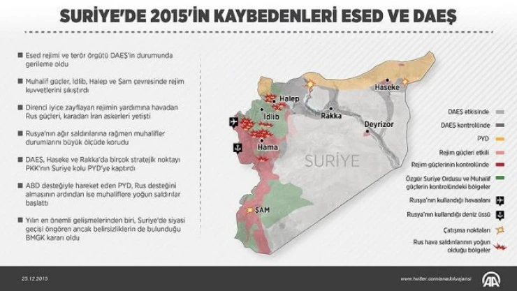 Beşinci yılına giren Suriye iç savaşı, 2015 yılında birçok dönüm noktasına sahne oldu. Terör örgütleri DAEŞ ve PYD arasındaki çatışmalarda PYD ABD'nin hava desteğiyle birçok stratejik noktaya ele geçirdi. Esed rejimi muhalif güçlerin ilerlemesi karşısında zora girdi. Rejimin yardımına koşan Rusya havadan, İran ise giderek artan kara gücüyle savaşa dahil oldu. 2015, rejim ve muhalifler arasında müzakereleri başlatmayı öngören Birleşmiş Milletler Güvenlik Konseyi (BMGK) kararıyla sona eriyor.