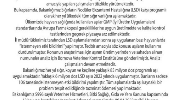 Tarım ve Orman Bakanlığına bağlı Gıda ve Kontrol Genel Müdürlüğü, sosyal medya hesabından bakanlığın sığırların Nodüler Ekzantemi (LSD) hastalığına karşı programlı olarak her yıl ülkede tüm sığır varlığına yapılan aşılamaya ilişkin bir açıklama yaptı. Açıklamada, Tarım ve Orman İl Müdürlükleri tarafından LSD aşılamalarından sonra aşı uygulanan bazı havanlarda “istenmeyen etki” bildirimi yapıldığı kaydedilerek, “Tedbir amacıyla söz konusu aşıların kullanımı durdurulmuştur. Konunun araştırılması için aşının üretim yerinden ve sahadan alınan numuneler analiz için Bornova Veteriner Kontrol Enstitüsü’ne gönderilmiştir. Analiz çalışmaları devam etmektedir. Bakanlığımız her yıl sığır, koyun ve keçilere yaklaşık 85 milyon doz programlı aşı uygulamaktadır. Yaklaşık 6 milyon doz LSD aşısı 2022 yılında uygulanmıştır. Bunların sadece 106 tanesinde istenmeyen etki bildirimi yapılmıştır. Tüm aşılamalarda aşı kaynaklı bir problem tespit edildiğinde tazminat ödemesi yapılmaktadır” ifadelerine yer verildi.
