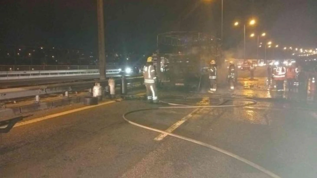 TEM Otoyolu'nda oksijen tüpü yüklü kamyon alev alev yandı. Kamyonda yüklü tüplerin patlama tehlikesine karşı yol iki taraflı olarak trafiğe kapatılırken, uzun araç kuyrukları oluştu. Yangın, itfaiye ekiplerinin uzun uğraşları sonucu söndürüldü.