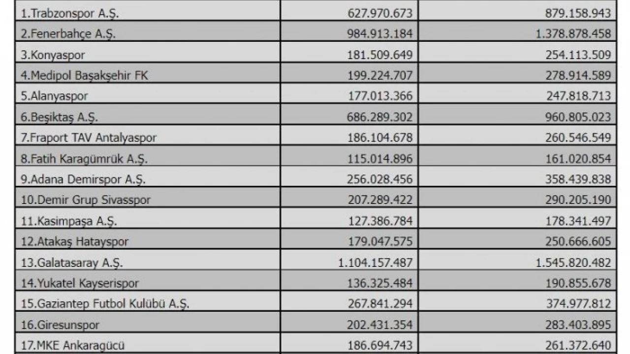 Buna göre yüzde 40 sapma ile birlikte en yüksek takım harcama limitine sahip takım 1 milyar 545 milyon 820 bin 482 TL ile Galatasaray oldu. Sarı-kırmızılıları, 1 milyar 378 milyon 878 bin 458 TL ile Fenerbahçe ve 960 milyon 805 bin 23 TL tutarla Beşiktaş takip etti. Spor Toto Süper Lig’in son şampiyonu Trabzonspor’un ise Takım Harcama Limiti 879 milyon 158 bin 943 TL olarak belirlendi.