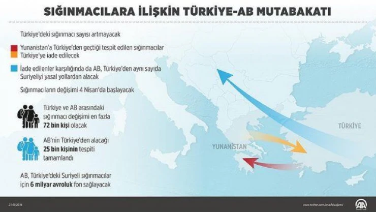 Başbakan Ahmet Davutoğlu'nun katılımıyla 18 Mart'ta Türkiye-AB Zirvesi'nde varılan uzlaşmaya göre, Türkiye'den Yunan adalarına geçen tüm yeni düzensiz göçmenler Türkiye'ye gönderilecek. Dün yürürlüğe giren plan, insani krize son vererek kamu düzenini sağlamak için gerekli geçici ve olağanüstü bir önlem niteliğinde.