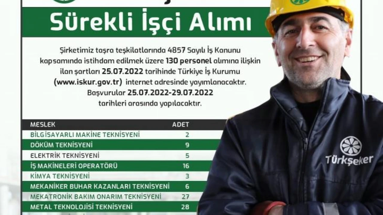 Türkşeker, taşra teşkilatında istihdam edilmek üzere 130 sürekli işçi alınacağını sosyal medya hesabından duyurdu. Açıklamada, şu ifadelere yer verildi: