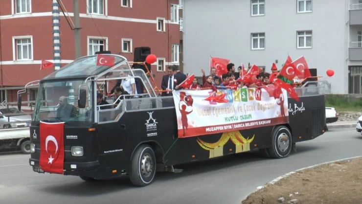Sahilde düzenlenen etkinliğin ardından, minik öğrenciler ilçe protokolü ile birlikte Darıca Belediyesine ait üstü açık otobüse bindi. Hareketli çocuk müzikleri eşliğinde ay yıldızlı bayrağı coşkuyla dalgalandıran çocuklar, tüm ilçeyi dolaşan otobüste vatandaşları selamladı. Sokaklardaki ve evlerinin camlarındaki vatandaşlar da çocuklara el salladı.