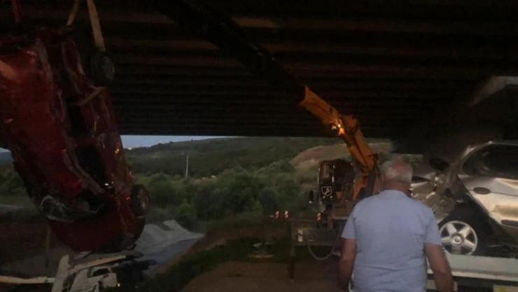Viyadükten uçan otomobil yüklü tır olay yerinden kaldırıldı