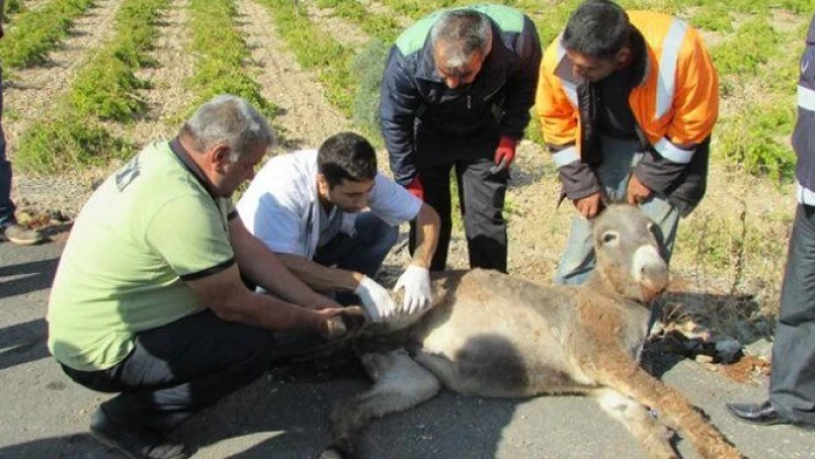 Gaziantep'in İslahiye ilçesinde kamyonun çarptığı eşek, sedyeyle hayvan ambulansına alınarak hayvanat bahçesine götürüldü.