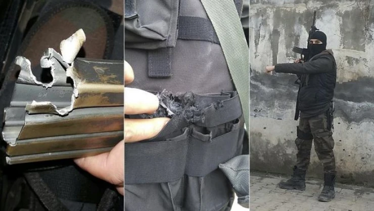 Cudi Mahallesi'nde terör örgütü PKK'ya yönelik operasyona katılan özel harekat polisi İbrahim A, bir arkadaşını şehit verdiği çatışmada merminin yeleğindeki yedek şarjöre isabet etmesi sonucu yara almadan kurtuldu. Teröristlerin bir başka atışı ise boynundaki silahın askısını delip geçti.