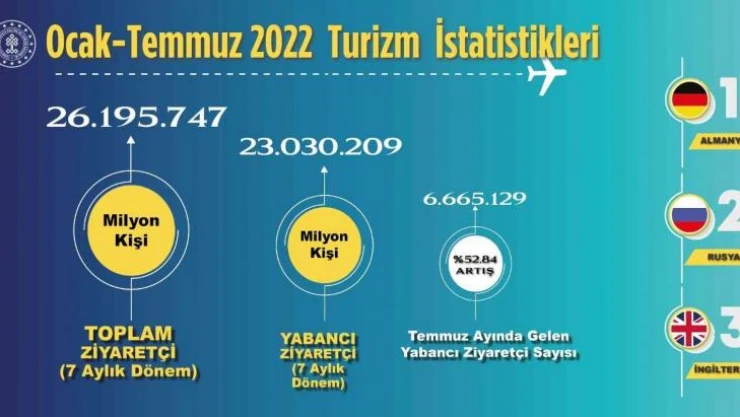 Türkiye bu yılın ilk 7 ayında toplam 26 milyon 195 bin 747 ziyaretçi ağırladı. Almanya, Rusya Federasyonu ve İngiltere sırasıyla en çok ziyaretçi gönderen ülkeler oldu.